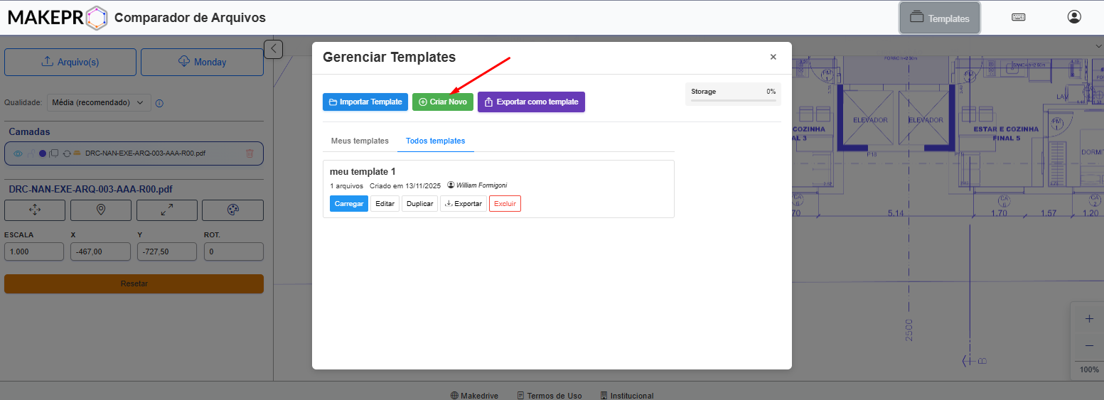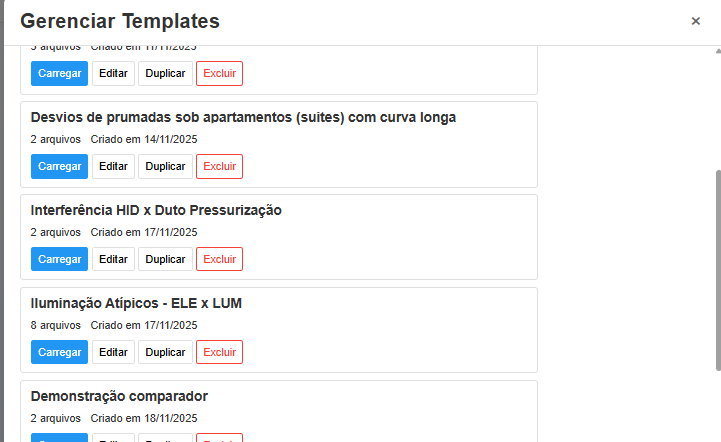Templates salvam o estado completo dos arquivos abertos no Comparador, incluindo configurações visuais, apontamentos e metadados. Permitem restaurar sessões de trabalho rapidamente.