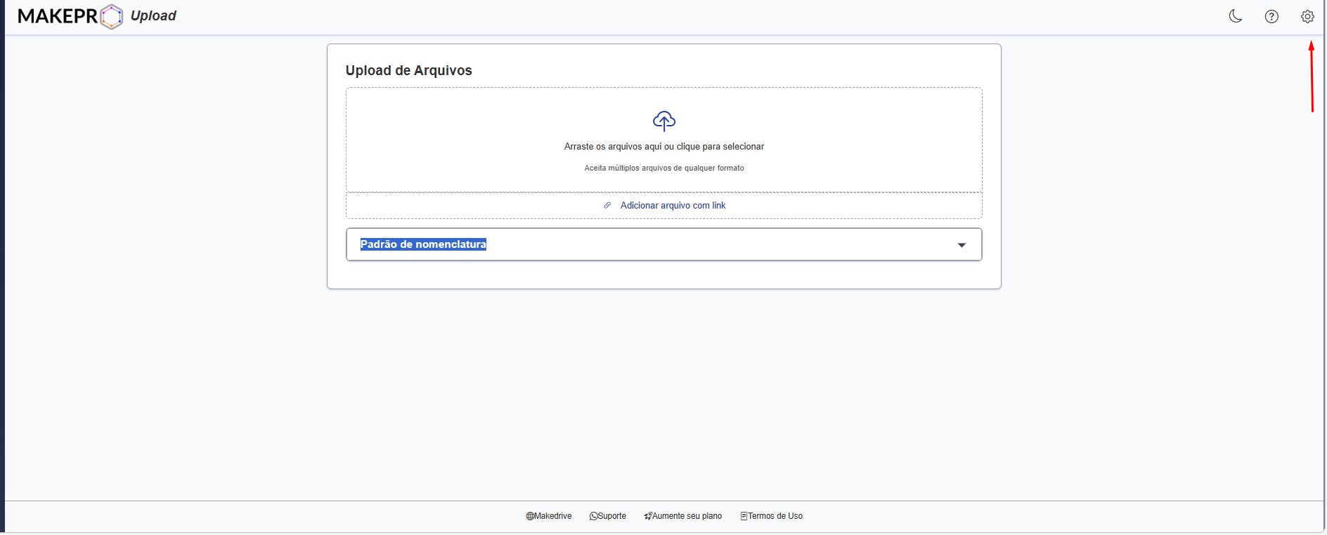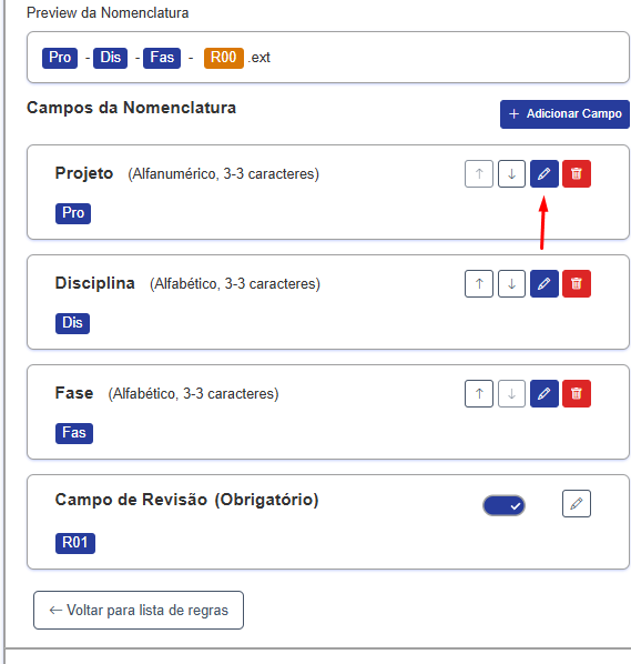 Seção de edição de regras de nomenclatura no módulo Upload Configuração das regras de nomenclatura no módulo Upload Edição de campo de nomenclatura no módulo Upload
