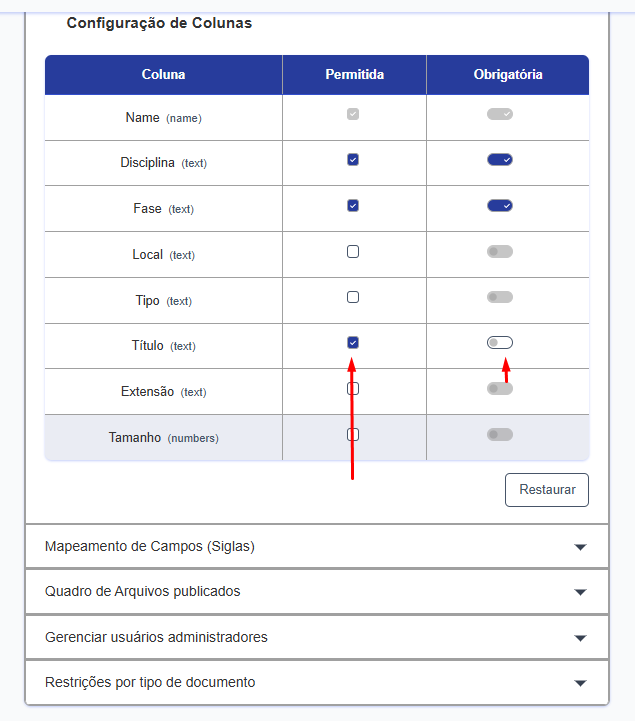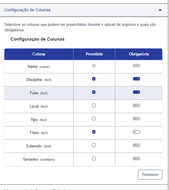 Configuração de colunas obrigatórias no módulo Upload Edição das colunas obrigatórias no módulo Upload