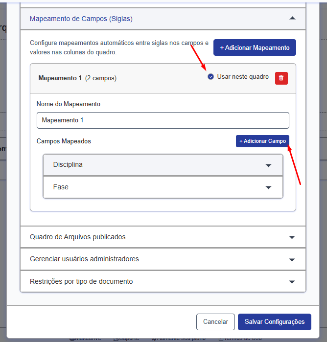 1. No modal de configurações, expanda "Mapeamento de Campos"