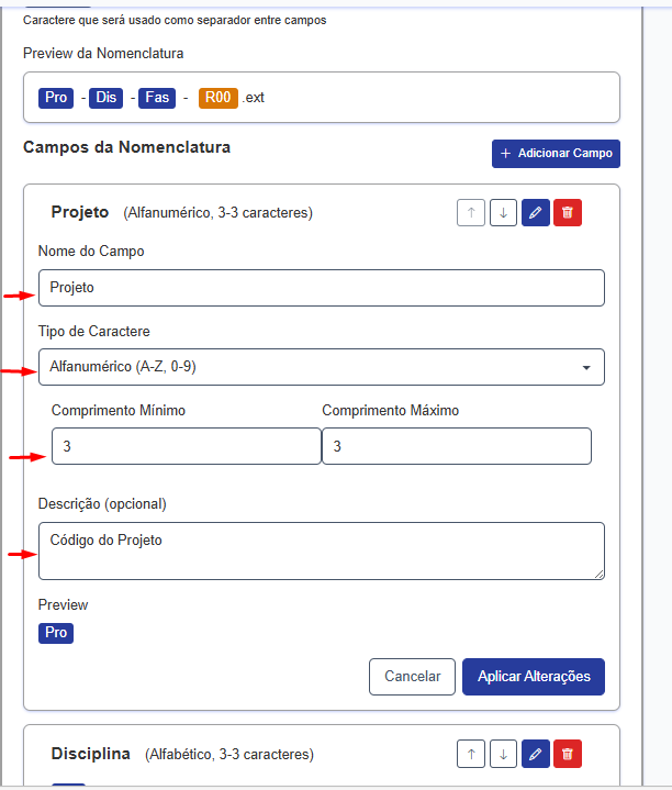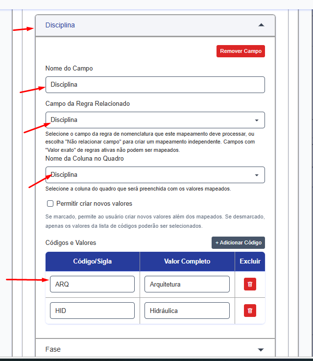 • Nome do Campo: Identificação do campo (ex: "Disciplina", "Fase")