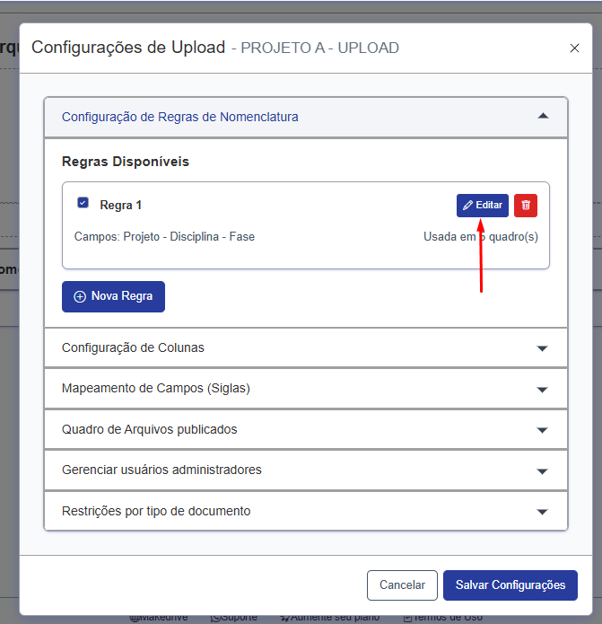1. No modal de configurações, expanda "Configuração de regras de nomenclatura"
